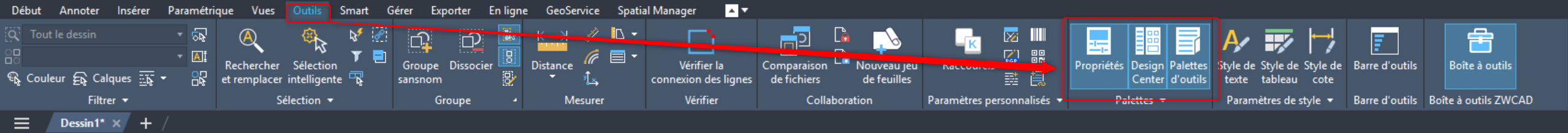 Il peut arriver qu’une palette ou une boîte de dialogue s’ouvre hors de la zone visible de l’écran. Ce comportement survient généralement à la suite d’une modification de la configuration multi-écran : Windows 10 et/ou ZWCAD n’a pas réinitialisé correctement les coordonnées d’affichage, ce qui empêche la palette de réapparaître dans l’espace de travail.