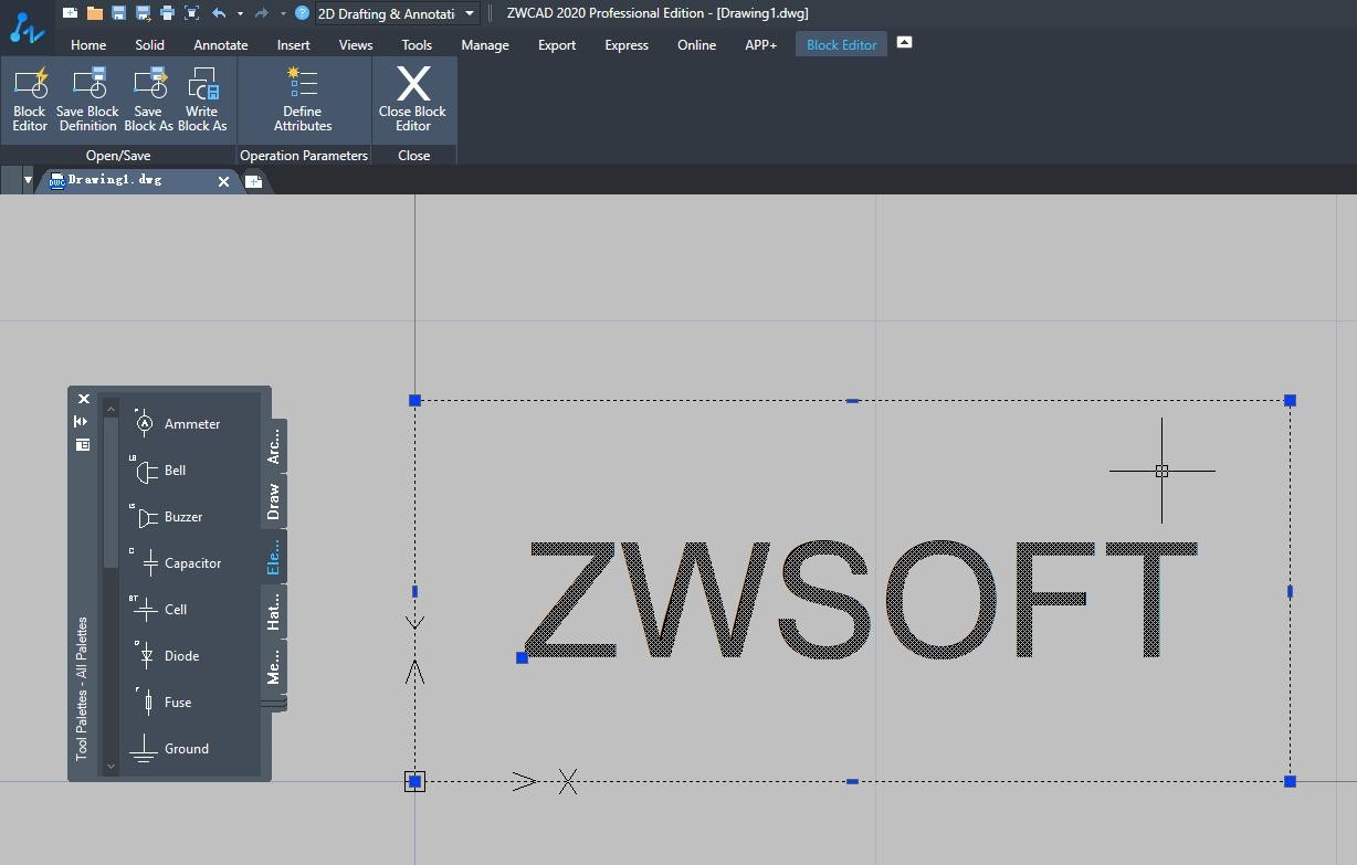 Lorsque vous définissez un bloc en l'ouvrant dans l'éditeur de blocs ou que vous sélectionnez un bloc existant pour l'ouvrir dans l'éditeur de blocs, l'onglet contextuel ou la barre d'outils s'affiche comme illustré ci-dessous et la zone de dessin devient grisée. Dans l'éditeur de blocs, vous pouvez définir les objets d'une définition de bloc et les enregistrer en tant que nouveau bloc ou en tant que fichier de dessin.