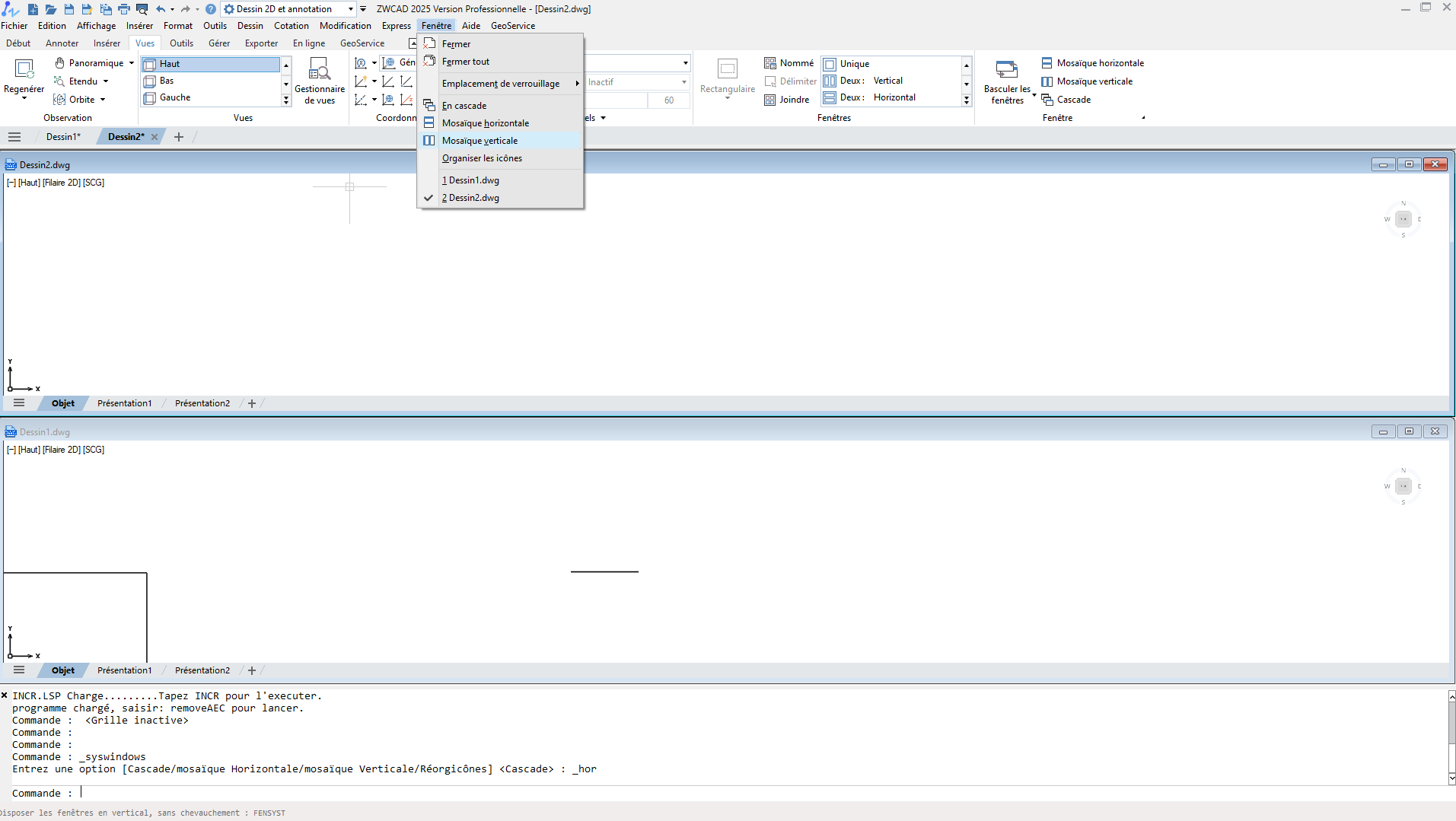 Dans le menu Fenêtre, les trois méthodes suivantes, qui déterminent la disposition des dessins, sont proposées au choix de l'utilisateur.