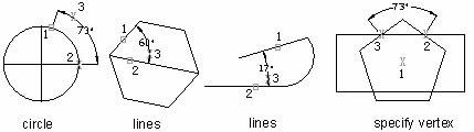 Les cotes angulaires sont généralement représentées par des segments d'arc. Pour créer une cote angulaire entre deux lignes non parallèles, l'arc de cote couvre l'angle formé par ces deux lignes. Lorsque vous spécifiez l'emplacement de l'arc de cote, si celui-ci n'intersecte pas une ou deux lignes d'attache, le système les trace automatiquement. l'arc de cote est toujours inférieur à 180 degrés. Cependant, pour les cercles et les arcs, l'arc de cote peut atteindre 360 degrés.