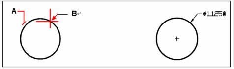 Sélectionnez le cercle (A), puis spécifiez l'emplacement de la ligne de cote (B).