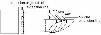 La première ligne d'extension se situe du côté où vous avez spécifié l'origine de la première ligne d'extension. Si vous créez une cote pour une ligne, vous ne spécifiez pas l'origine de la ligne d'extension. En effet, l'extrémité de la ligne la plus proche du point que vous avez spécifié devient l'origine de la première ligne de prolongement. En général, les lignes d'extension sont perpendiculaires à la ligne de cote. Toutefois, si l'espace est insuffisant, vous pouvez les rendre obliques, comme illustré dans la figure ci-dessus.