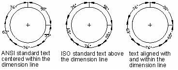 Dans les normes ANSI, le texte centré divise la ligne de cote. Dans les normes ISO, le texte centré se place au-dessus ou à l'extérieur de la ligne de cote. Dans les illustrations suivantes, les normes ISO autorisent l'affichage du texte de cote angulaire de l'une ou l'autre des manières indiquées.