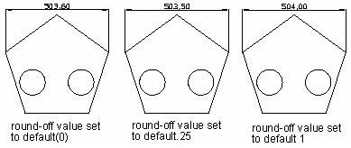 À l'exception des cotes angulaires, toutes les autres valeurs de cotes peuvent être arrondies. Par exemple, si vous spécifiez une valeur d'arrondi de 0,75, toutes les distances sont arrondies au multiple de 0,75 le plus proche. Le nombre de décimales est déterminé par la précision définie pour les unités principales et secondaires ainsi que pour les valeurs de tolérances latérales.