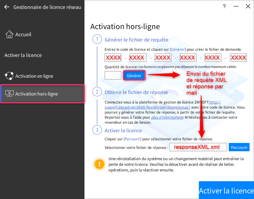 1️⃣ Cliquez sur Activer la licence puis Activation hors-ligne