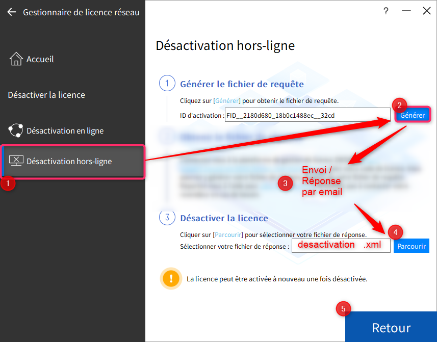 1️⃣ Cliquez sur Rendre la licence puis Désactivation hors ligne