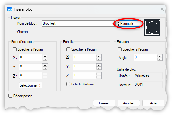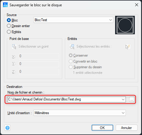 Par défaut, le fichier DWG correspond au nom du bloc. La définition du bloc reste mémorisée dans le dessin courant.