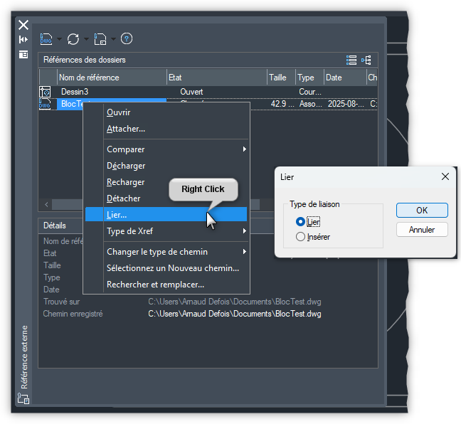 Une référence externe (XRef) attachée au dessin peut être transformée en bloc.