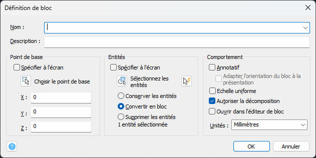 Quelle que soit l’option sélectionnée (Conserver, Convertir en bloc ou Supprimer), le bloc sera créé et mémorisé dans le dessin courant.