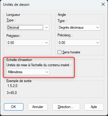 Le réglage peut être vérifié ou modifié dans les options, rubrique Contrôle des unités (commande UNITES ou _UNITS).