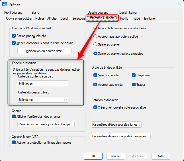 Cela se fait dans Unités du dessin cible depuis la boîte des options.